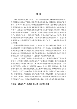 I摘要2007年美国的次贷危机导致了08年的华尔街金融风暴和全球性的金融危机。发达国家的经济陷入了衰退,国际消费需求大幅收缩,中国制造业受到了严重的影响,至2008年末已经有众多的外贸型企业停产或倒闭。竞争环境日益激烈已经是个不争的事实,客户需求也逐渐呈现出复杂化、多样化的趋势。在如此艰难的环境下,企业为了生存和发展想到了几十年前在夹缝中迅速成长的丰田,精益生产便在全世界范围内得到了广泛应用。精益生产的基本思想就是通过实现准时化生产,消除生产过程中一切不必要的浪费。它要求以客户为中心,只在客户需要的时候提供所需产品的所需数量。目前国内实施精益生产的企业不少,但是成功的案例不多。如何根据自己的实...